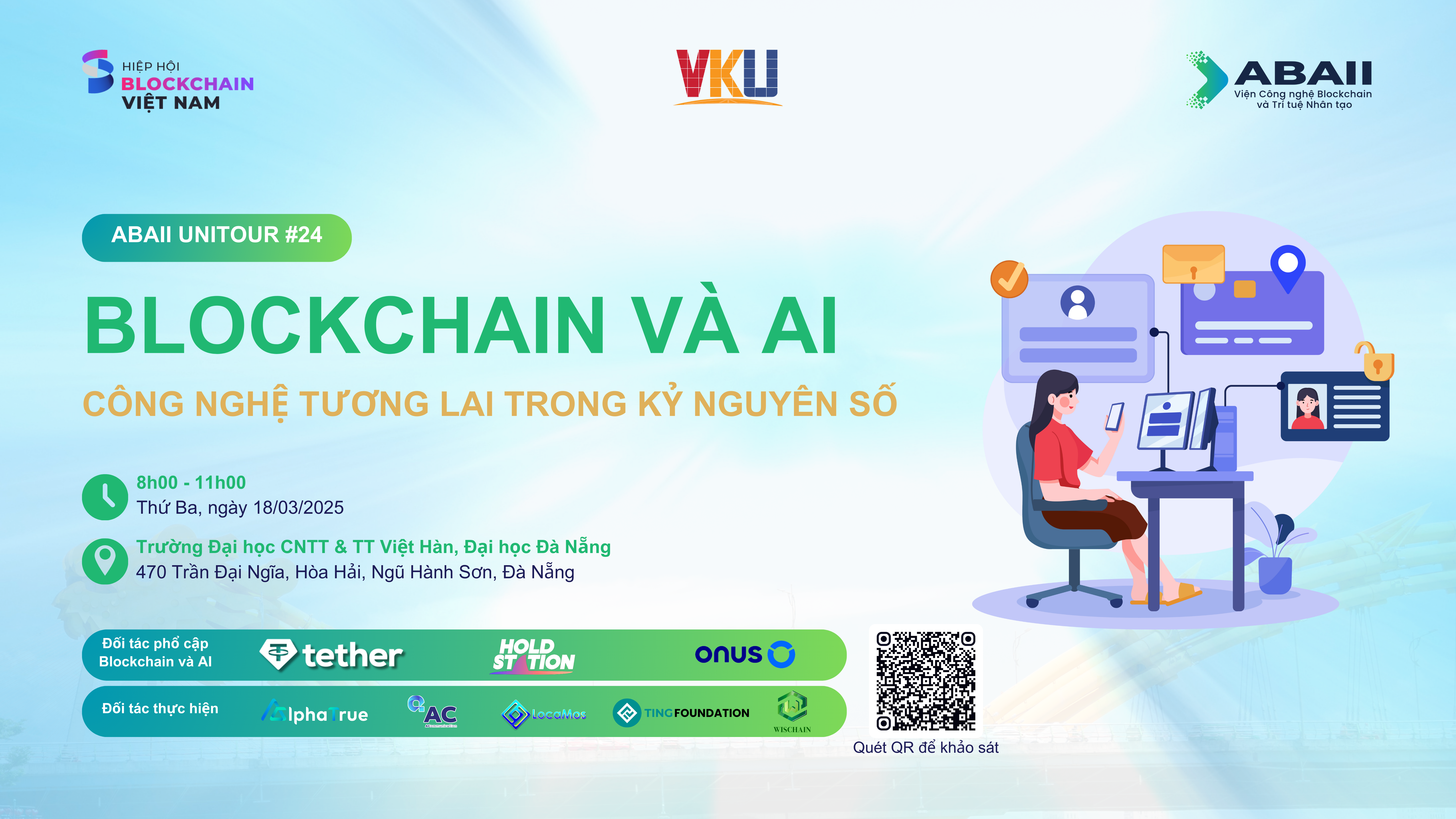 Sự kiện ABAII Unitour 24 với chủ đề “Blockchain và AI: Công nghệ tương lai trong kỷ nguyên số”, diễn ra vào ngày 18/03/2025 tại Trường Đại học Công nghệ Thông tin và Truyền thông Việt Hàn – Đại học Đà Nẵng, hứa hẹn sẽ mang đến nhiều thông tin giá trị cho các bạn sinh viên đam mê công nghệ.