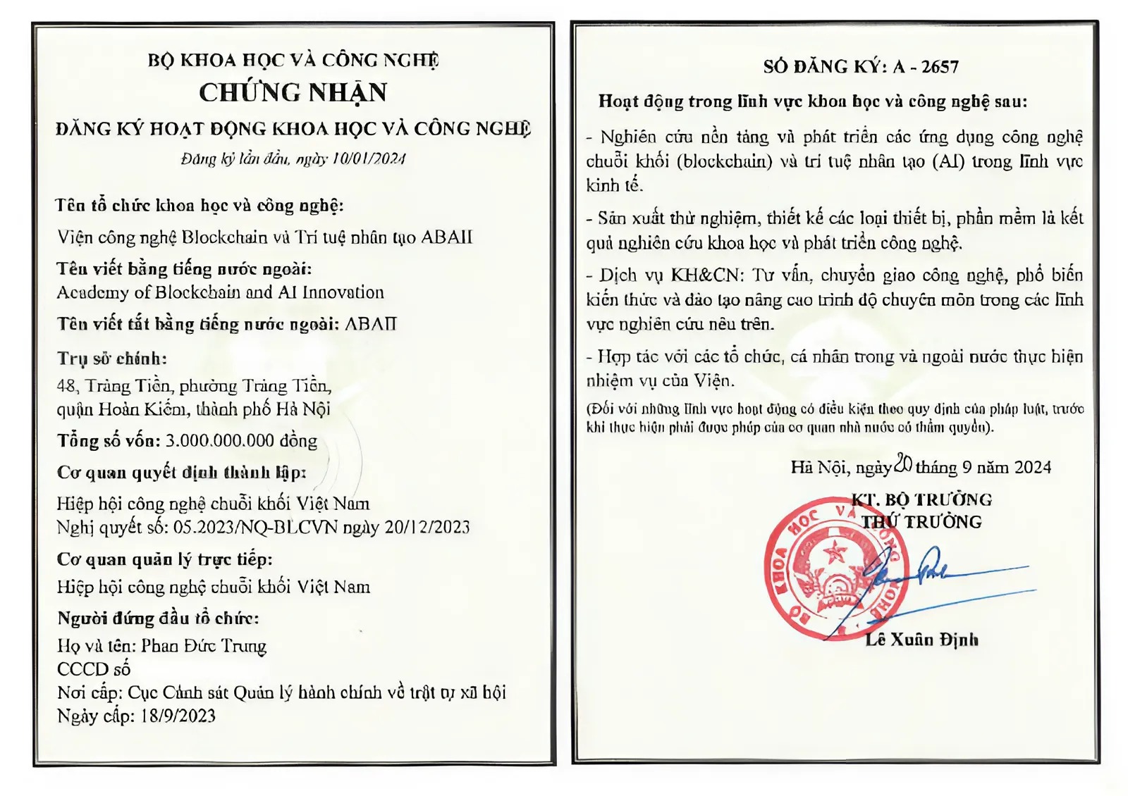Viện Công nghệ Blockchain và Trí tuệ nhân tạo ABAII được chính thức thành lập ngày 10/1/2024 theo Giấy chứng nhận Đăng ký hoạt động Khoa học Công nghệ số A-2657 của Bộ Khoa học và Công nghệ.