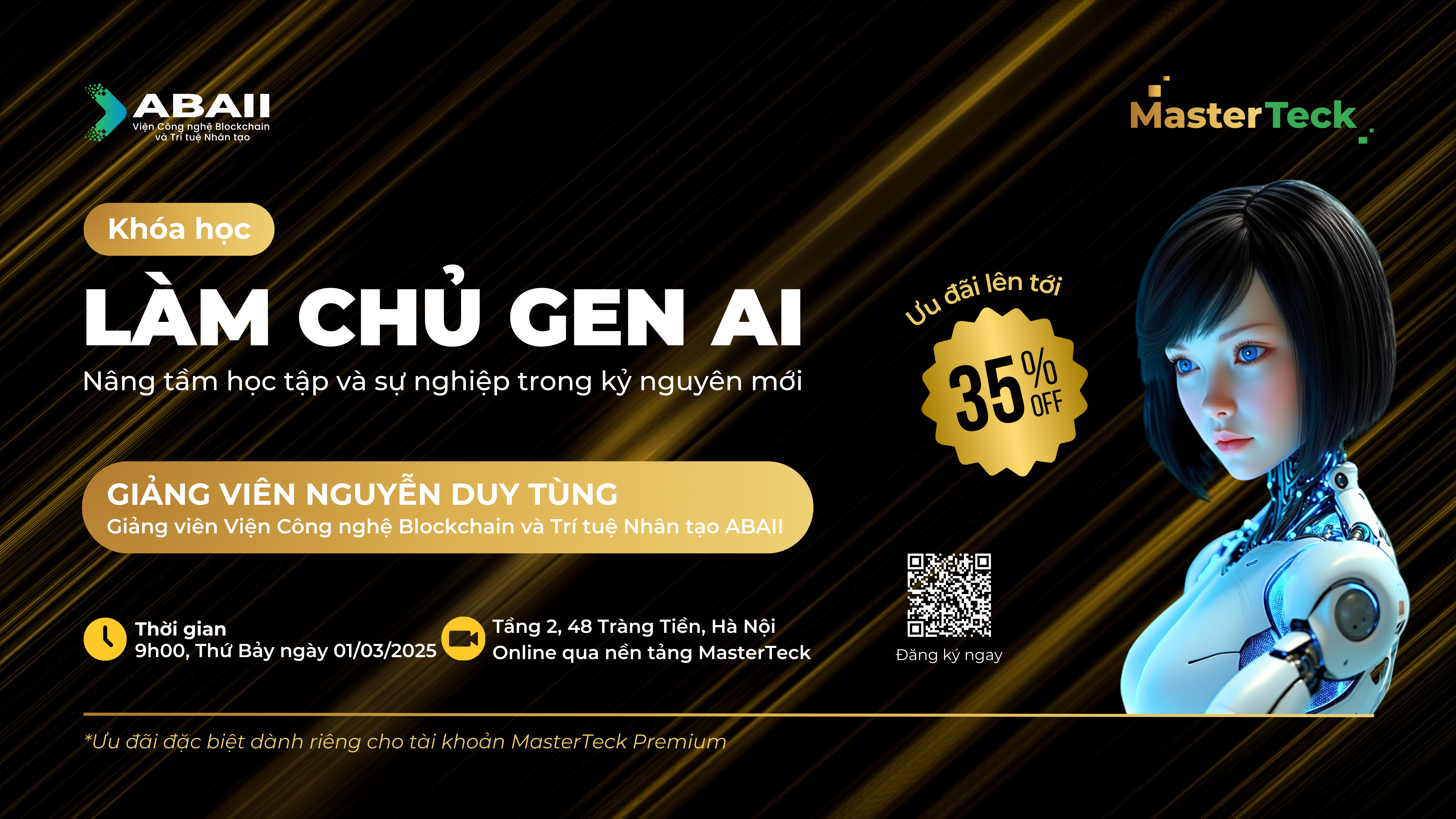 Khóa học sẽ diễn ra online trên nền tảng MasterTeck, 9:00, Thứ Bảy, ngày 01/03/2025, dành cho học viên đã đăng ký tài khoản Premium MasterTeck, và hoàn tất đăng ký trước 12:00 ngày 28/02/2025.
