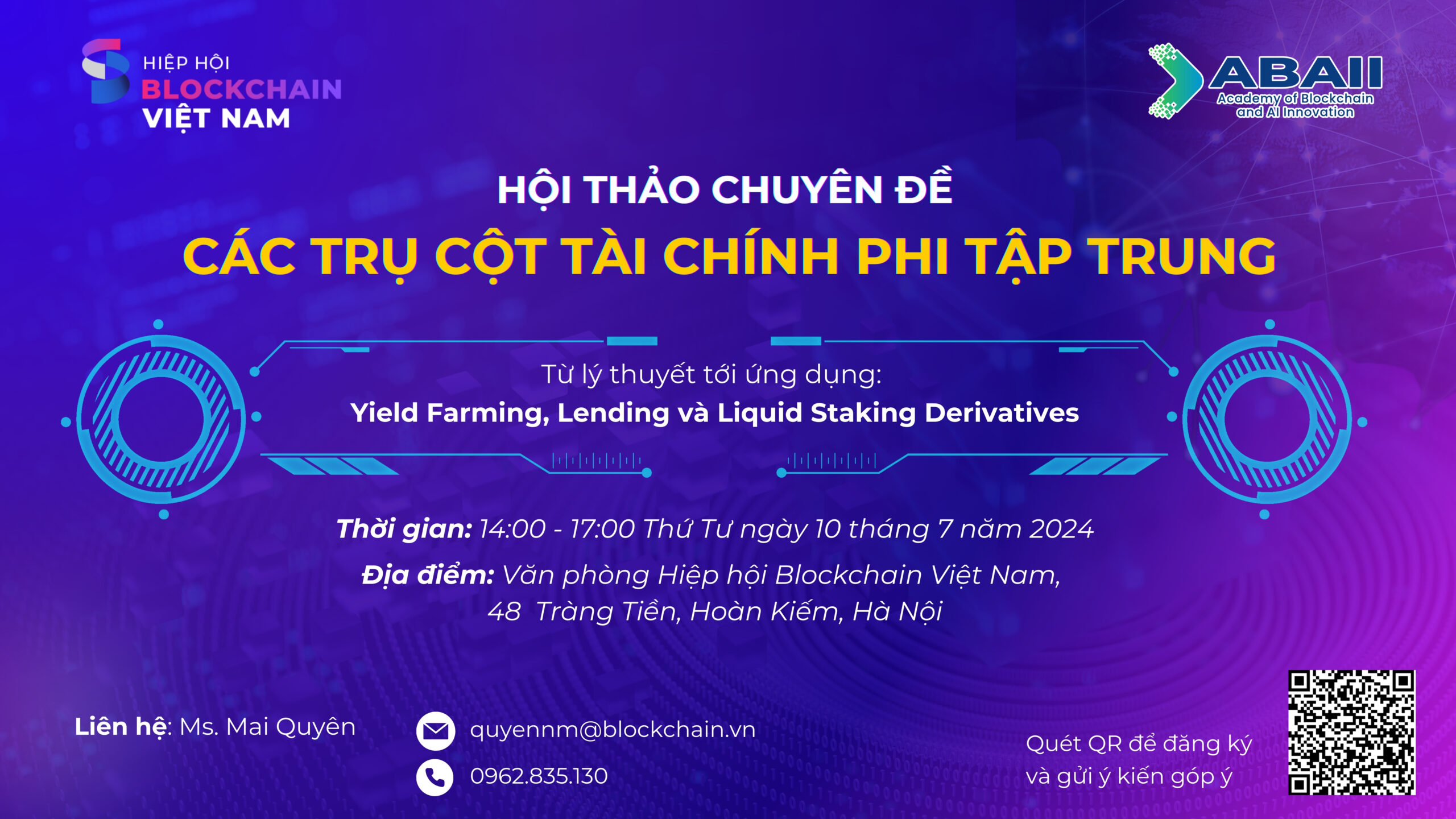 on 2 Tháng 7 2024 at 15:54 Hội thảo chuyên đề “Các trụ cột Tài chính phi tập trung – Từ lý thuyết tới ứng dụng: Yield Farming, Lending và Liquid Staking Derivatives” Tiếp nối chuỗi hội thảo chuyên đề về các ứng dụng của công nghệ... >>>