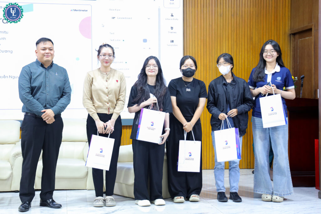 Đại diện nhà trường trao hoa và quà cảm ơn tới các diễn giả và khách mời tại tọa đàm.