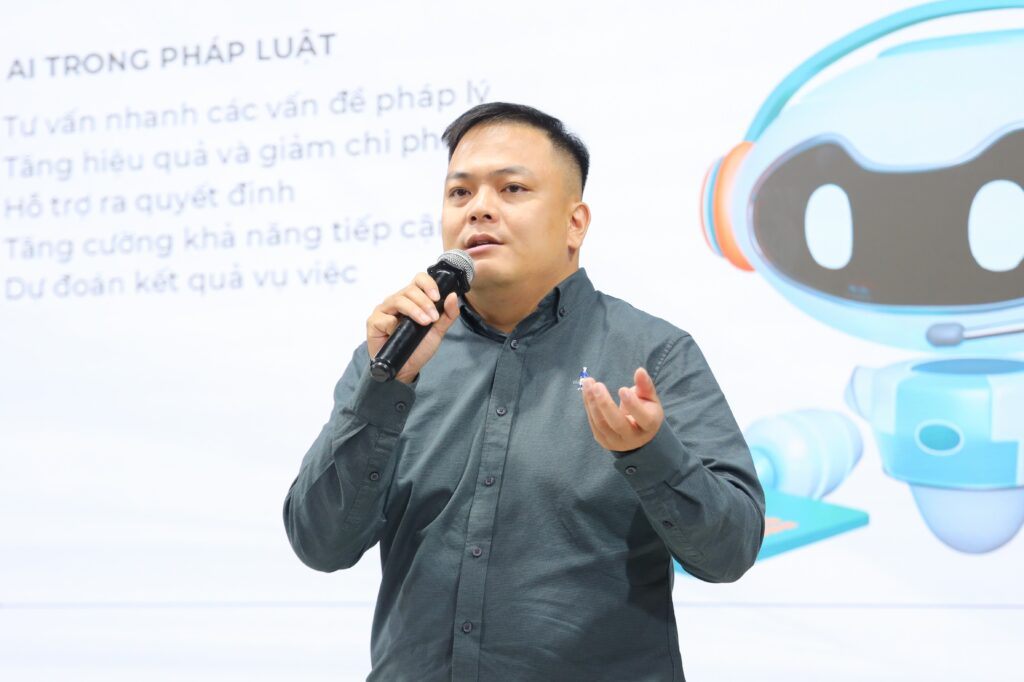 Ông Hàng Minh Lợi, Giám đôc Trung tâm Sáng tạo AI giới thiệu Ứng dụng AI tra cứu luật tới sinh viên.