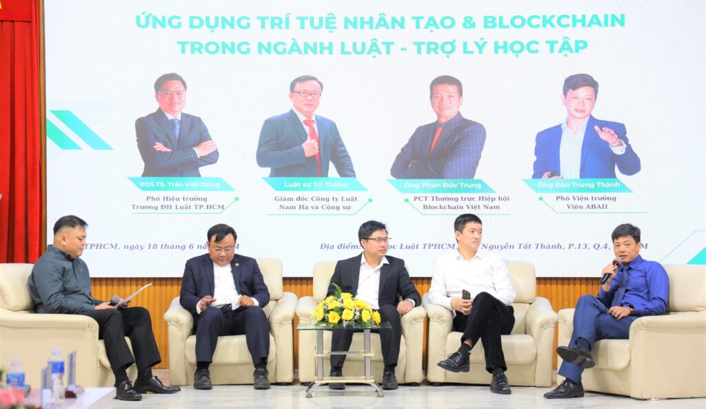 Cũng tại chương trình, các chuyên gia hàng đầu về pháp lý, công nghệ như ông Phan Đức Trung (Phó Chủ tịch thường trực Hiệp hội Blockchain Việt Nam); ông Đào Trung Thành (Phó Viện trưởng Viện ABAII); luật sư Nguyễn Tri Thắng (Giám đốc Công ty Luật Nam Hà và cộng sự) và PGS.TS Trần Việt Dũng (Phó Hiệu trưởng trường ĐH Luật TPHCM) đã có buổi trao đổi cởi mở, thẳng thắn về việc ứng dụng công nghệ blockchain và AI vào ngành luật cũng như các vấn đề pháp lý, đạo đức hiện đang được cộng đồng rất quan tâm.