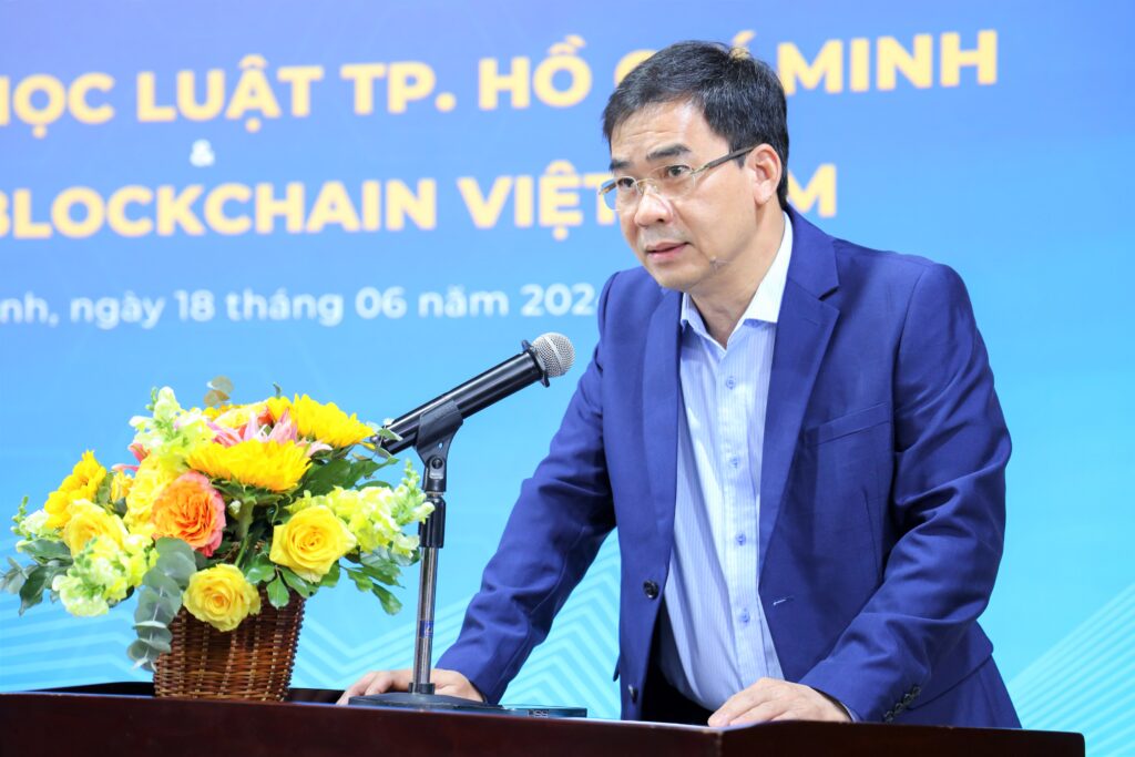 Phát biểu khai mạc chương trình, TS. Lê Trường Sơn, Hiệu trưởng Trường ĐH Luật TPHCM chia sẻ: “Việc kết hợp giữa công nghệ và luật là một bước tiến mà nhà trường mong muốn cùng Hiệp hội Blockchain Việt Nam thúc đẩy phát triển mạnh mẽ ngay từ bây giờ. Để thực hiện hóa mục tiêu đó, ⁠chúng tôi sẽ xây dựng lộ trình các môn học ứng dụng công nghệ AI và Blockchain nói riêng và các công nghệ khác nói chung để giảng dạy cho sinh viên, tạo đầu ra chất lượng cho nguồn nhân lực trẻ Việt Nam”.